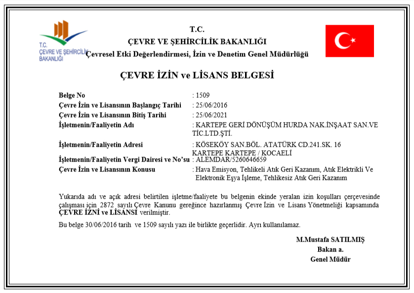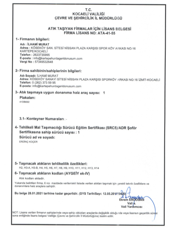 Tehlikeli Atık Taşıma Lisansı için Tıklayınız. Çevre İzin ve Lisans Belgesi Pdf İçin Tıklayınız. TAT Belgesi için Tıklayınız.